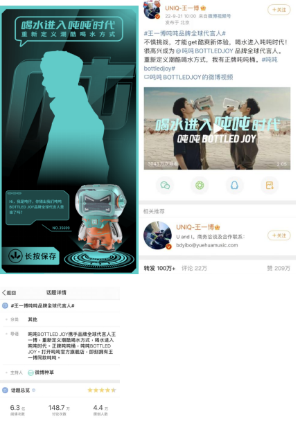 源于改善大眾健康飲水的初心和情懷,噸噸BOTTLED JOY專注健康水具16年,從OEM到OBM,從走紅海外到國內(nèi)上億曝光,品牌這些厚積薄發(fā)、乘風(fēng)破浪的點點滴滴與從出道至今王一博的經(jīng)歷高度契合。兩者的緣分早在王一博參加綜藝《這就是街舞4》,噸噸BOTTLED JOY不離身時就埋下了。在代言人官宣預(yù)熱階段,噸噸BOTTLED JOY互動H5驚喜上線,點燃用戶打卡熱情,首日突破10萬人次點擊。在官宣TVC中,噸噸BOTTLED JOY與代言人王一博一起重新定義潮酷喝水方式,播放量突破3000萬,藝人微博轉(zhuǎn)發(fā)量超100萬。微博話題#王一博噸噸品牌全球代言人#沖上熱搜,當(dāng)日即斬獲了超過6億的閱讀量,突破140萬討論數(shù),引發(fā)全域關(guān)注。