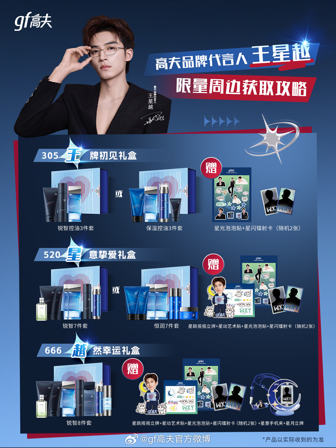 伴隨代言人官宣,高夫特別定制了包含立牌、泡泡貼、鐳射卡等一系列王星越專屬周邊。同期,品牌開啟京東小魔方新品日活動,為粉絲帶來「王」牌初見禮盒、「星」意摯愛禮盒、「越」然幸運禮盒及代言人親簽、閃卡等福利。
