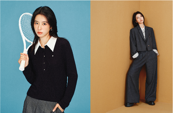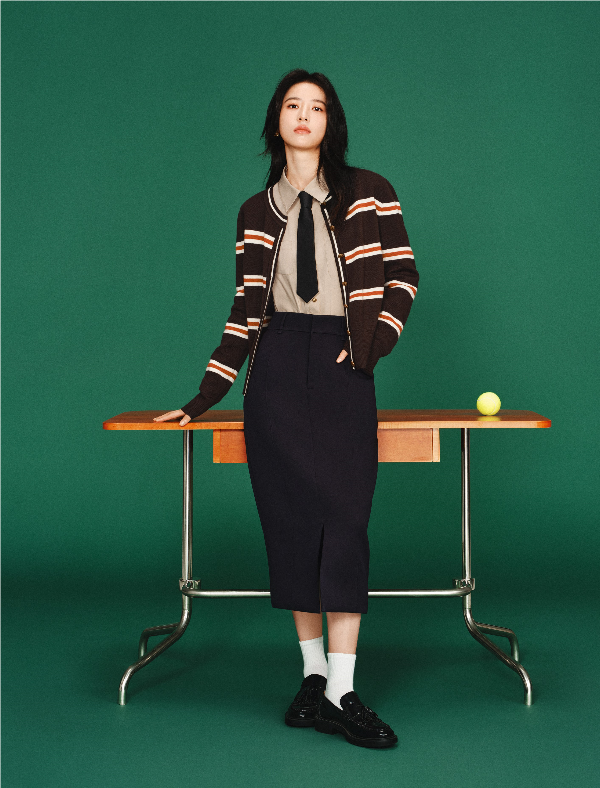 青藤學(xué)院感假兩件毛衫和中腰百褶裙塑造正統(tǒng)學(xué)院的書卷氣優(yōu)等生形象;多巴胺自然南瓜色系條紋毛織開衫搭配麥田色襯衫及直身開叉筒裙,平衡精英氣質(zhì)與松弛態(tài)度。多樣混搭的自由感造型與周雨彤直率輕盈的個性魅力相契合,傳遞PSALTER詩篇品牌不被傳統(tǒng)學(xué)院標(biāo)簽所固定,也不為自己設(shè)限的無畏個性。