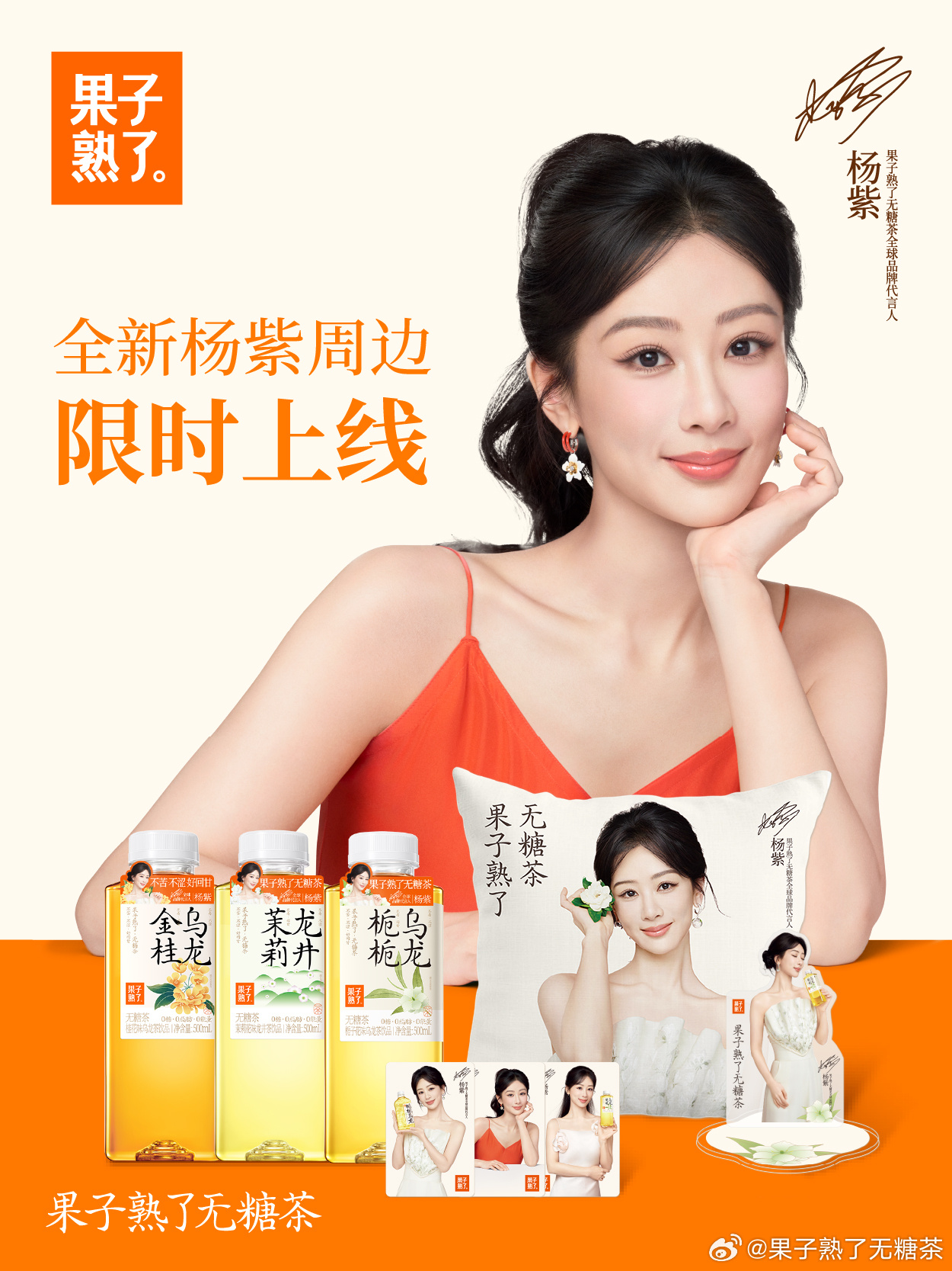 去年 5 月 6 日,果子熟了無糖茶官宣國民演員楊紫成為品牌代言人。時(shí)隔一年后,5 月 7 日,楊紫升任「果子熟了無糖茶全球品牌代言人」,并共同發(fā)布全新代言人 TVC。此外,品牌還推出了楊紫系列周邊,以滿足「紫米」們的需求。線下,果子熟了還在全球 16 城點(diǎn)亮大屏,用戶在線下拍照打卡,即有機(jī)會(huì)獲取親筆簽名照。