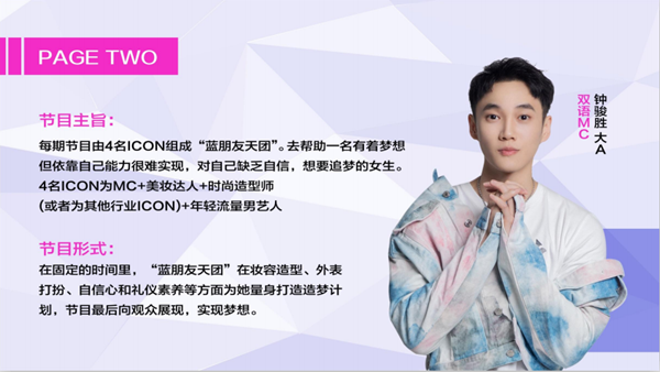 OMB我是你的藍(lán)朋友》一檔明星為素人造夢(mèng)的綜藝節(jié)目,由四位ICON組成“藍(lán)朋友天團(tuán)”,分別是常駐MC,美妝達(dá)人、時(shí)尚造型師和年輕流量小鮮肉。