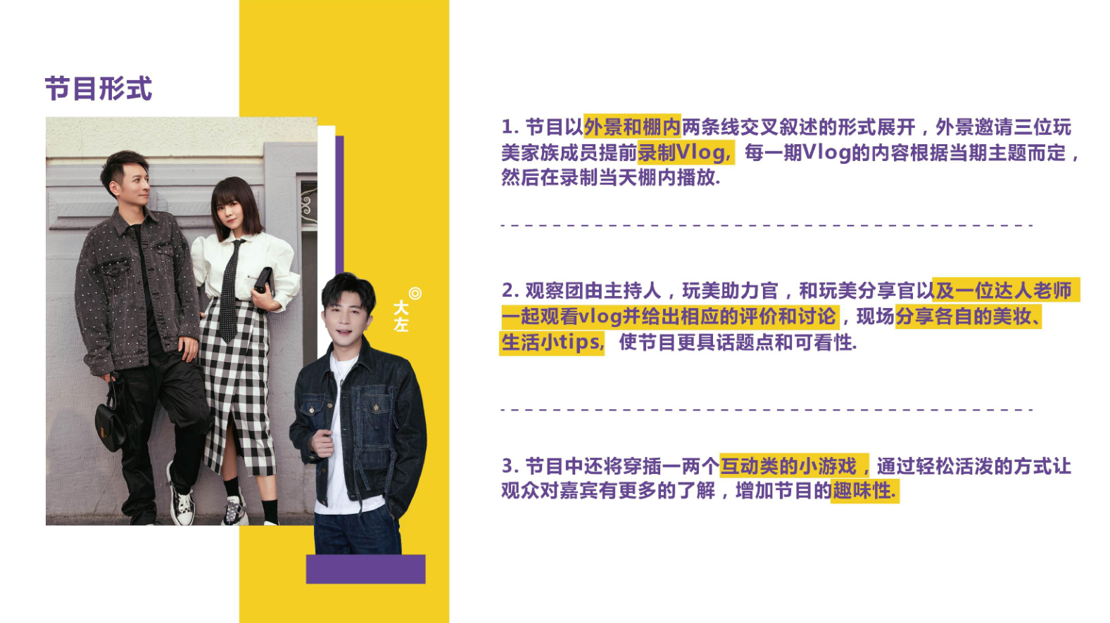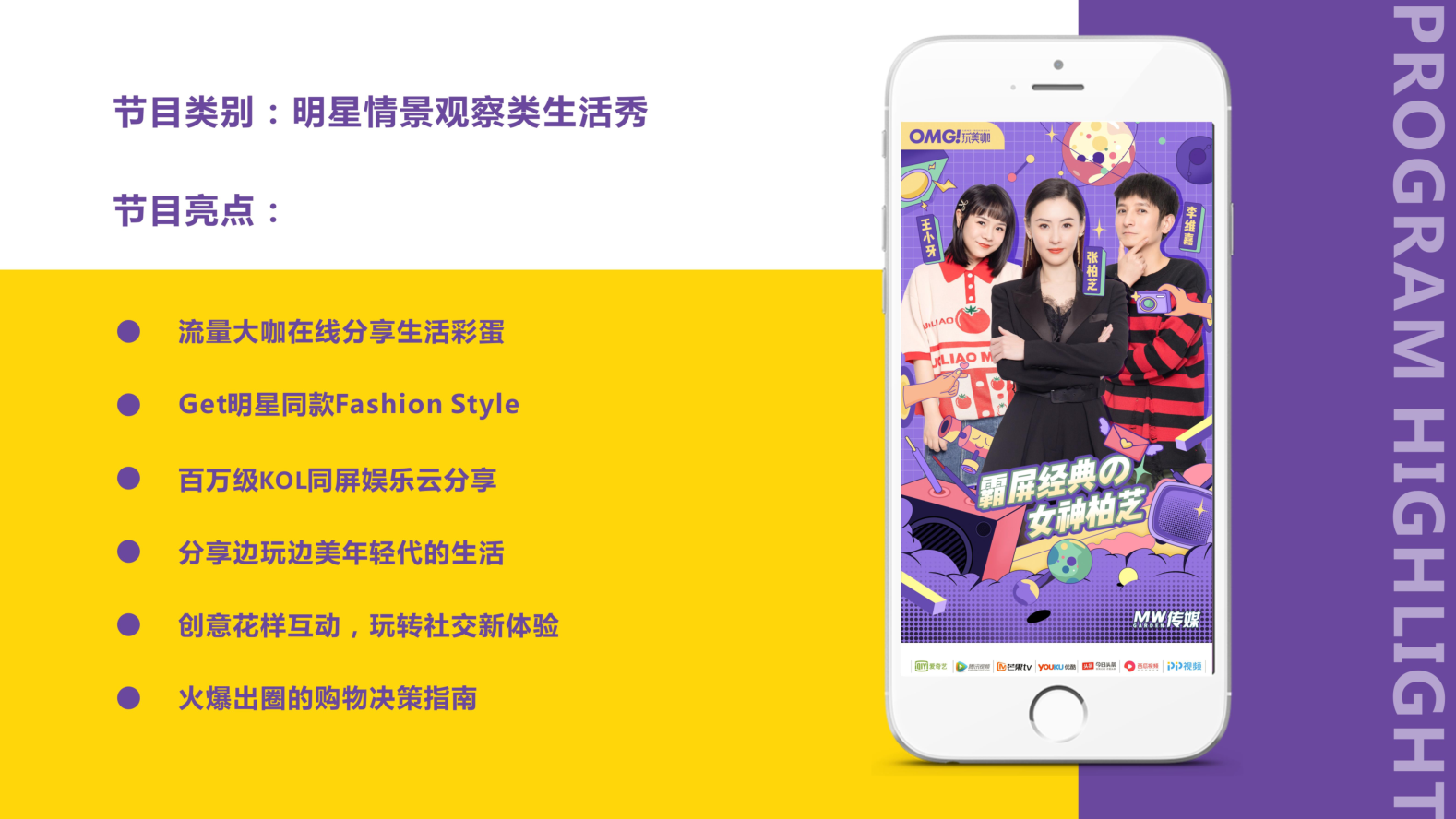 《OMG玩美咖》節(jié)目以亞洲女性為主力觀眾群體,擯棄演播室中傳統(tǒng)、枯燥的說教模式,將節(jié)目形式設(shè)定為純外景體驗式。采取時下最熱門的明星生活秀模式,明星閨蜜團在聚會般的輕松氛圍下分享和推薦,涵蓋都市潮流生活的方方面面,賦予觀眾切身時尚生活體驗。