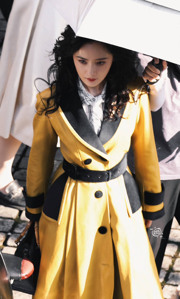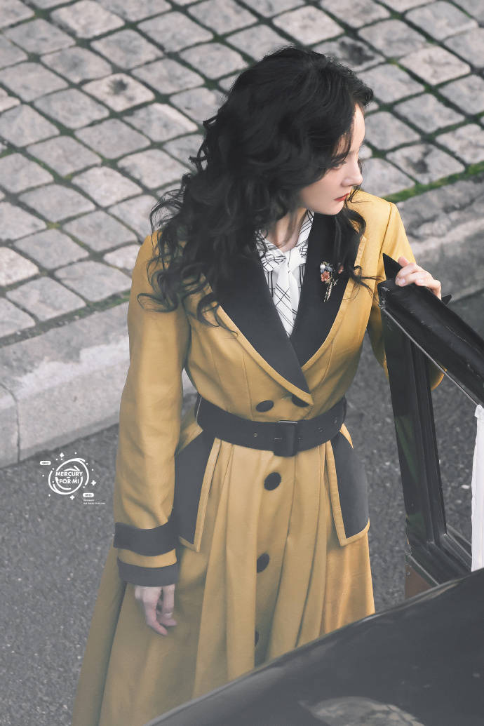 楊冪穿黃色大衣腰肢纖細(xì) 卷發(fā)紅唇造型復(fù)古優(yōu)雅