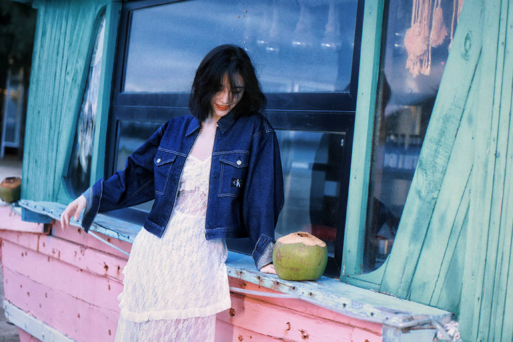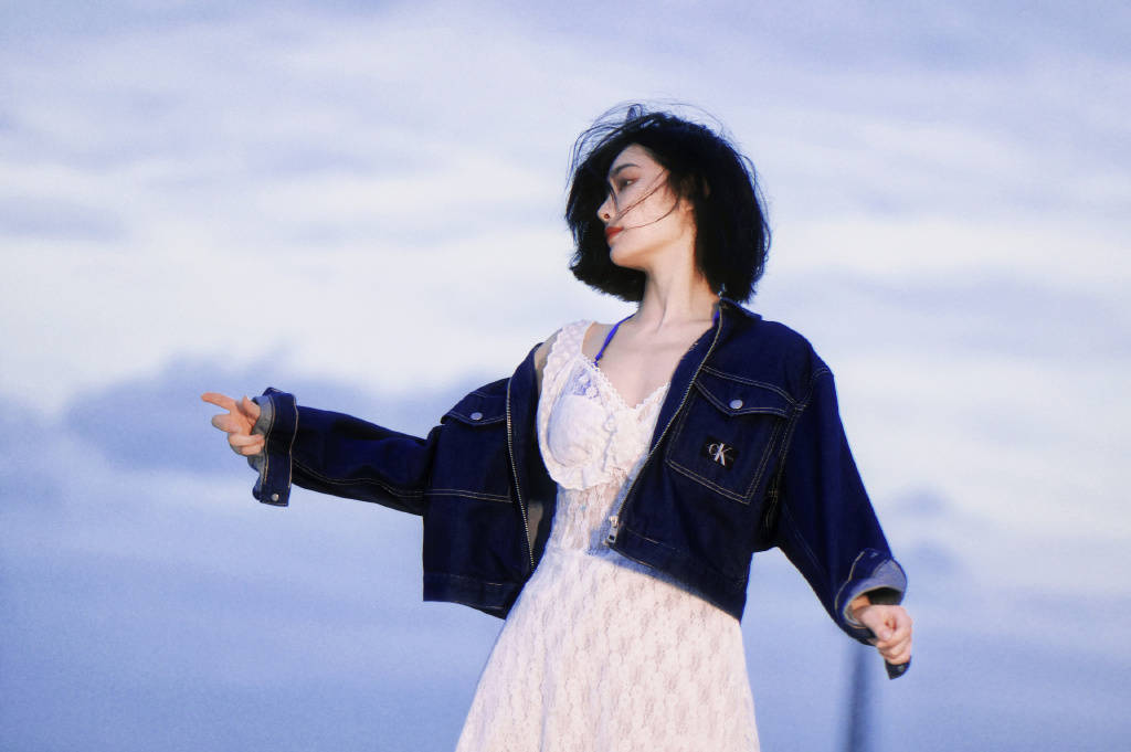 許佳琪海邊漫步感受夏末微風(fēng) 白裙搭牛仔衣有個性