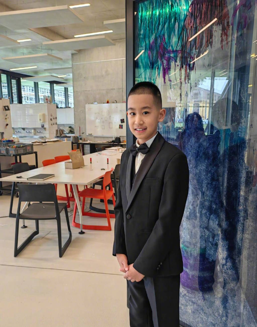 趙文卓兒子身穿西裝文質(zhì)彬彬。