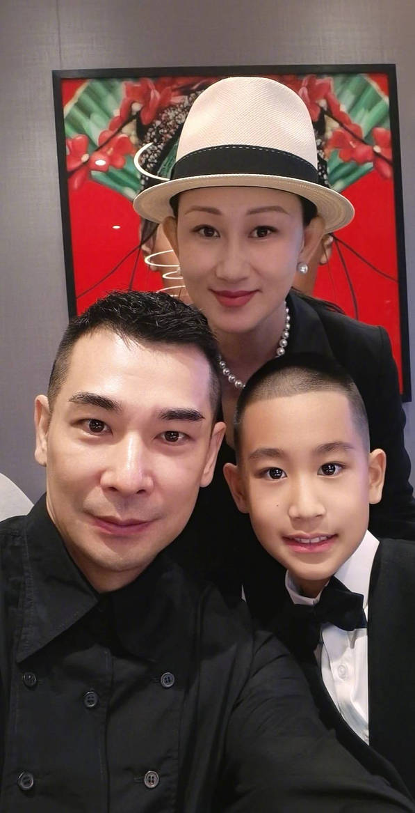 趙文卓和老婆張丹露與兒子的合影,一家人身穿西裝,神清氣爽。