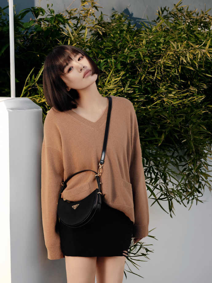 馬思純身穿咖色毛衣搭配黑色小短裙。