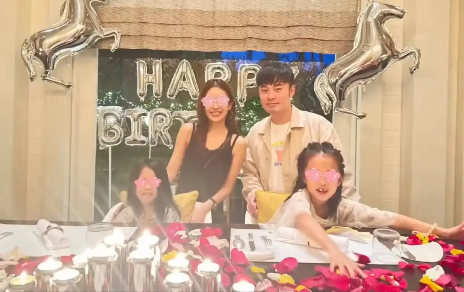 陳赫與張子萱兩人一左一右地坐在女兒們兩邊,對(duì)鏡頭干杯。