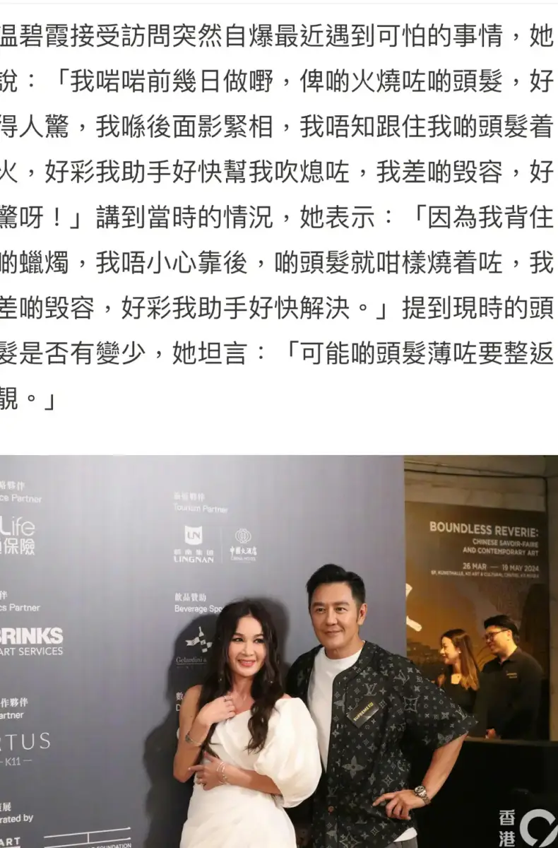 溫碧霞接受采訪時(shí)自曝出活動(dòng)時(shí)頭發(fā)被蠟燭點(diǎn)燃,幸好助手幫她吹滅,自己差點(diǎn)毀容,很驚險(xiǎn)!