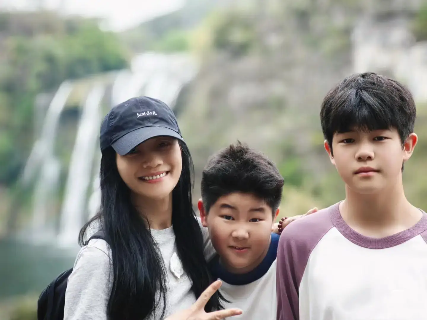 胡可與倆兒子在瀑布前合影留念,笑容非常燦爛。