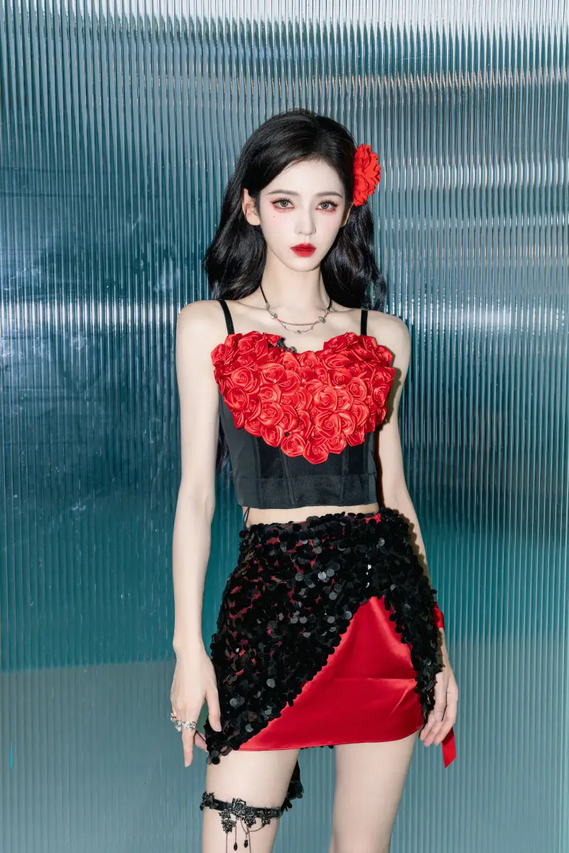 張予曦紅黑造型,發(fā)間別著一朵紅花,嫵媚動人。