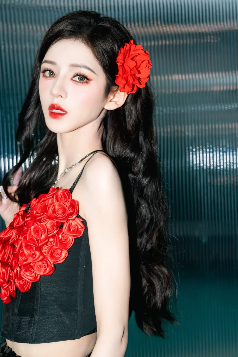 張予曦發(fā)間別紅花嫵媚動人 宛若嬌艷綻放的紅玫瑰