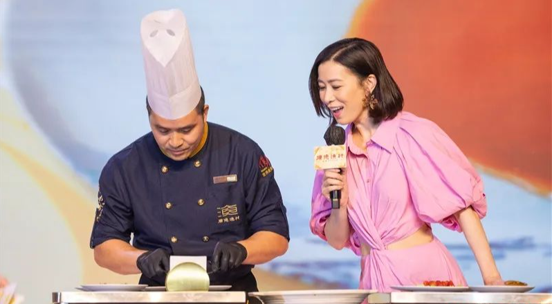 順德漁村的品牌形象代言人佘詩(shī)曼現(xiàn)場(chǎng)與順德漁村出品技術(shù)總監(jiān)李濟(jì)深互動(dòng)體驗(yàn)順德美食。