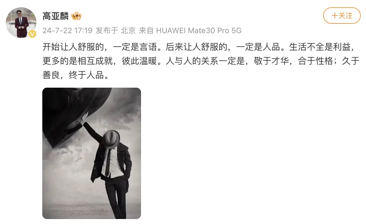 ???高亞麟風波后首發(fā)文:后來讓人舒服的,一定是人品