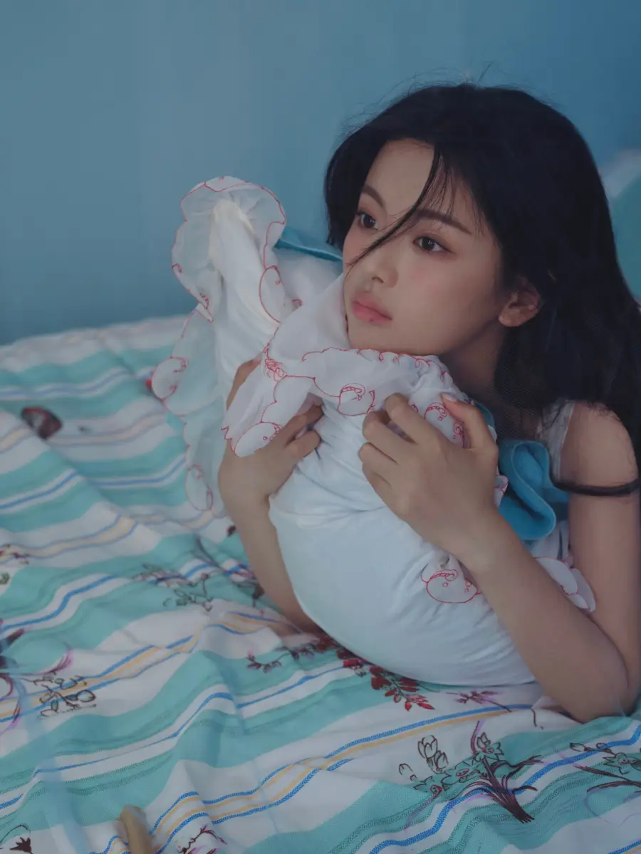 楊超越抱著枕頭的樣子就像小女孩一樣,超可愛。