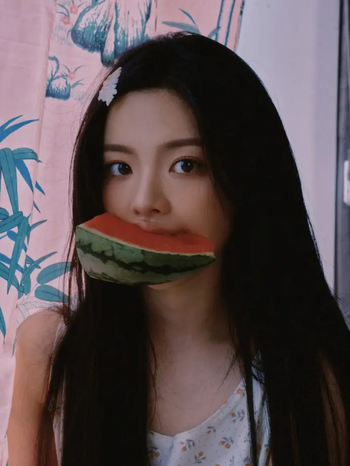 楊超越咬著西瓜,一雙靈動大眼炯炯有神。