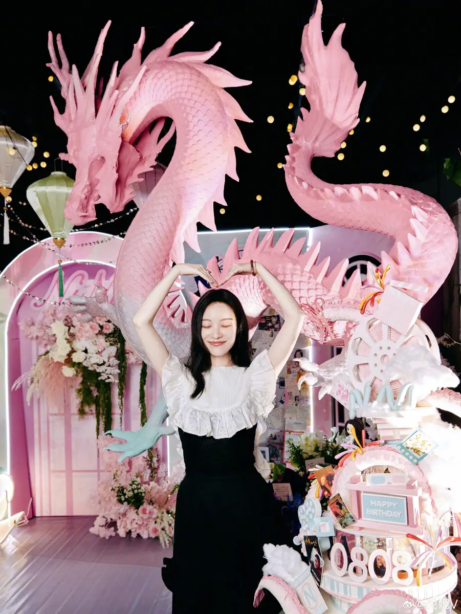 倪妮對著鏡頭比心,身后是一條巨龍,她的屬相就是龍。