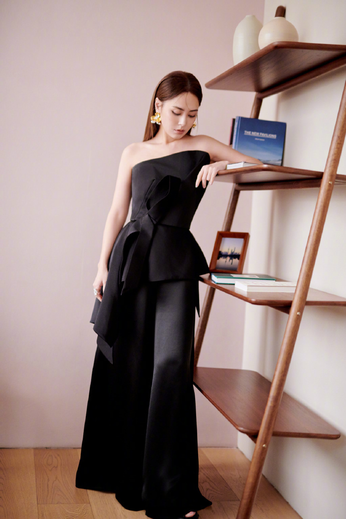 阿嬌身著黑色抹胸與黑色闊腿褲 千金感滿滿