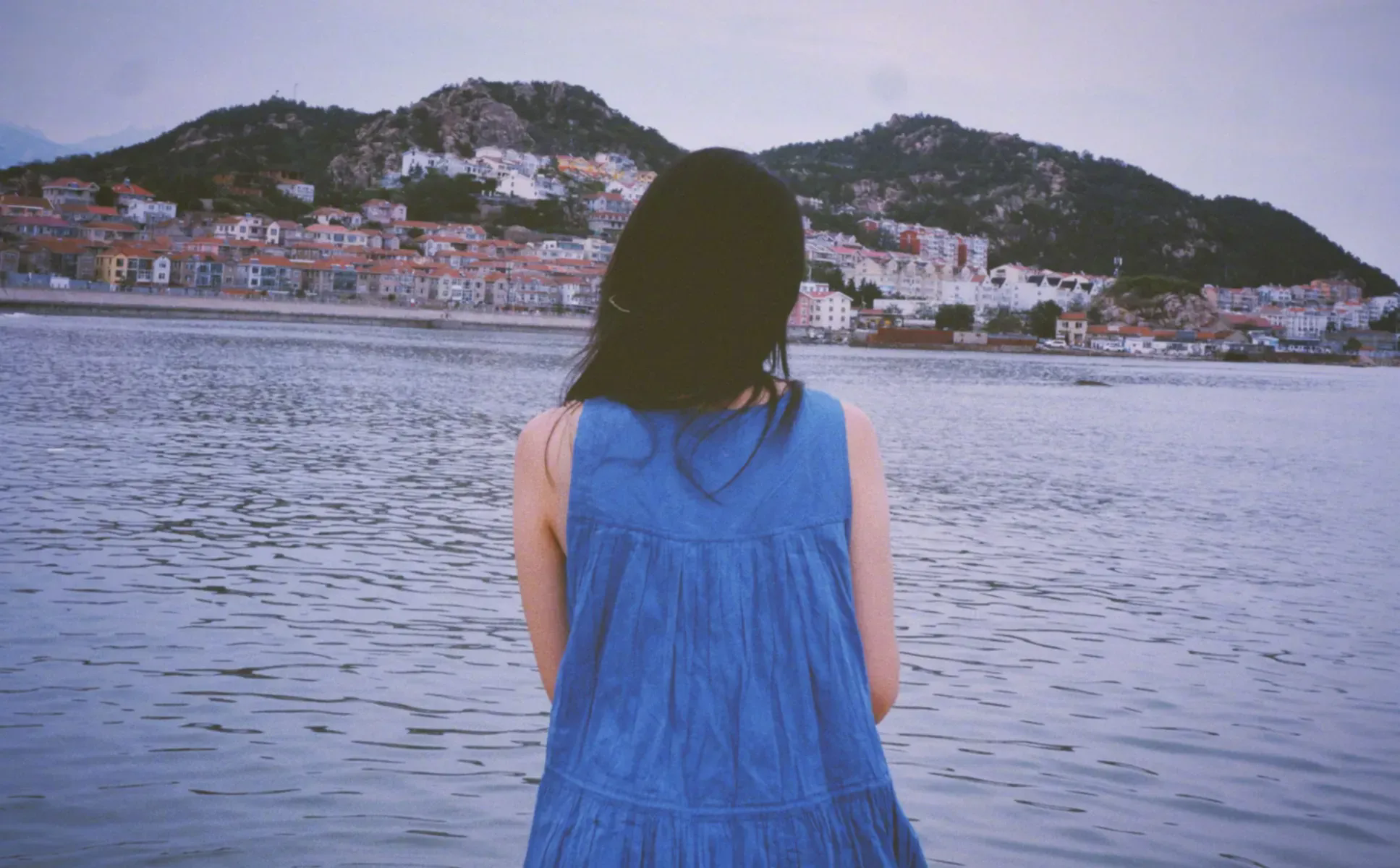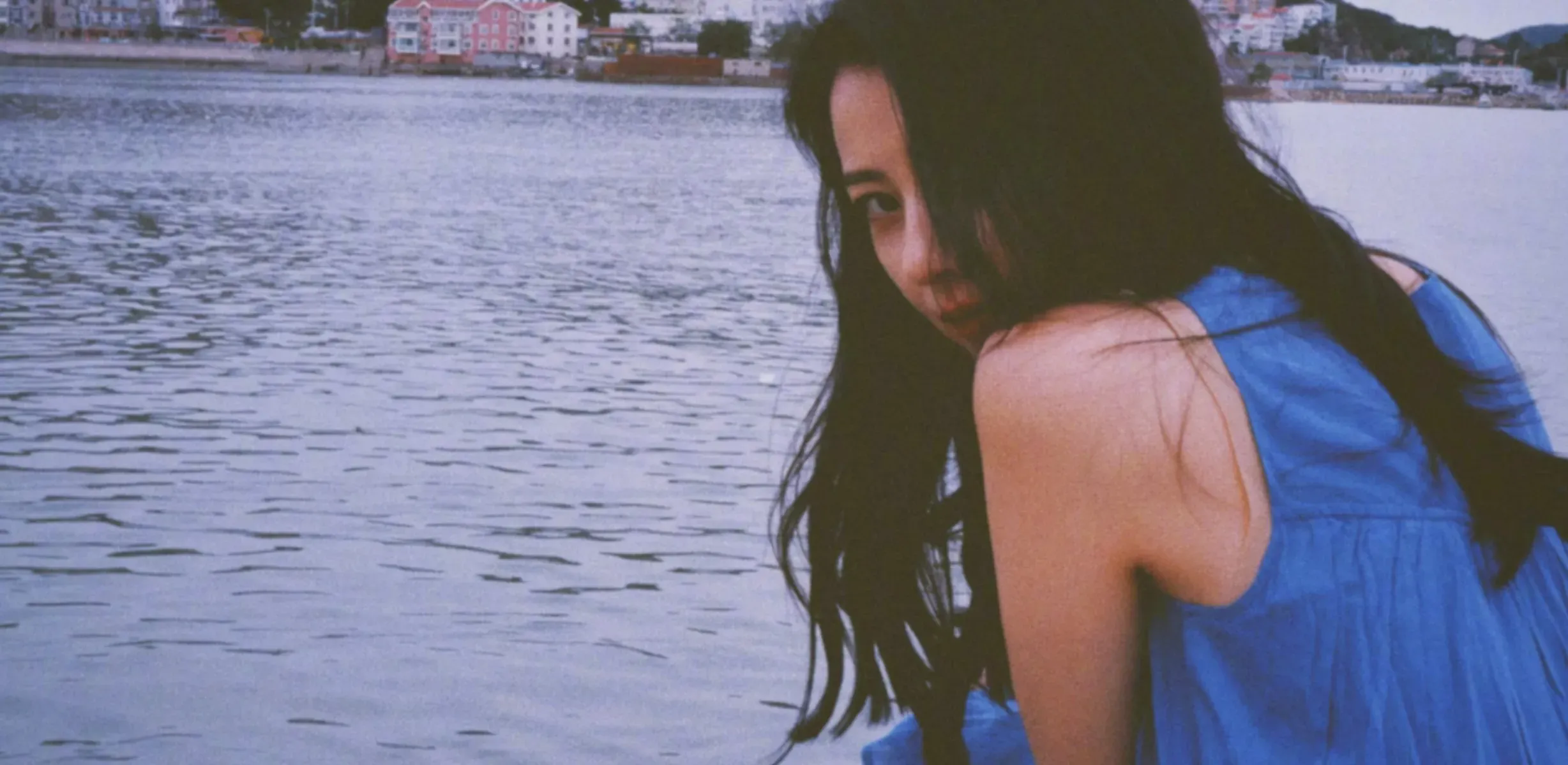 高圓圓穿藍(lán)色連衣裙和海邊適配度拉滿。