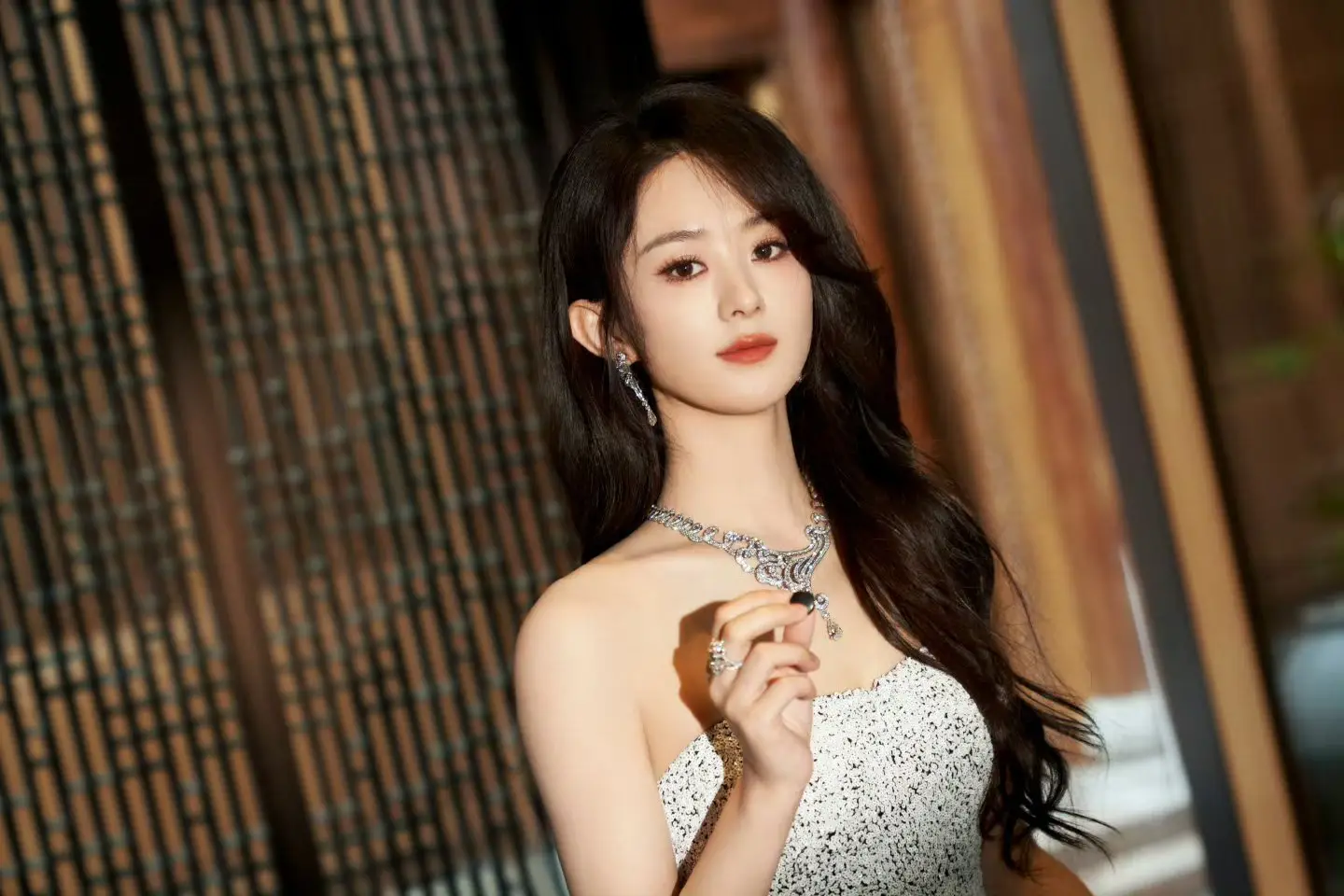 4月12日,趙麗穎一組新造型釋出,穿銀色閃光抹胸裙,番茄色口紅素雅的眼妝,華麗珠寶襯托得好貴氣。
