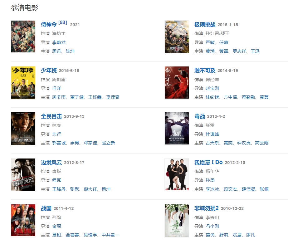 代表作品:全民目擊、毒戰(zhàn)、征服、潛伏、人間正道是滄桑、好先生、帶著爸爸去留學、新世界、掃黑風暴