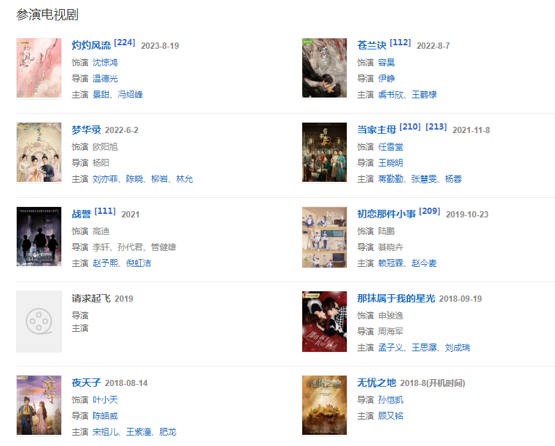 代表作品:醉玲瓏、熱血長安、重生之名流巨星、花千骨、大學生士兵的故事、新版紅樓夢、夜天子