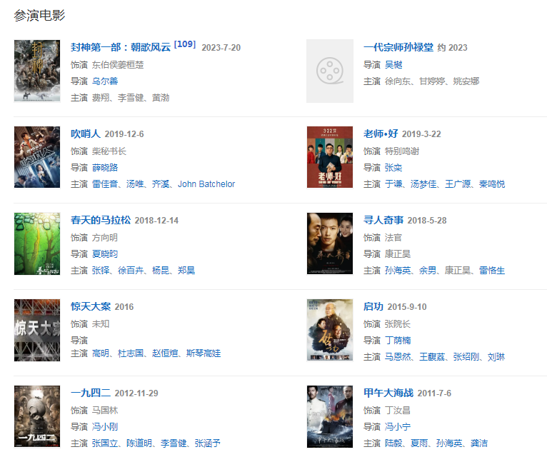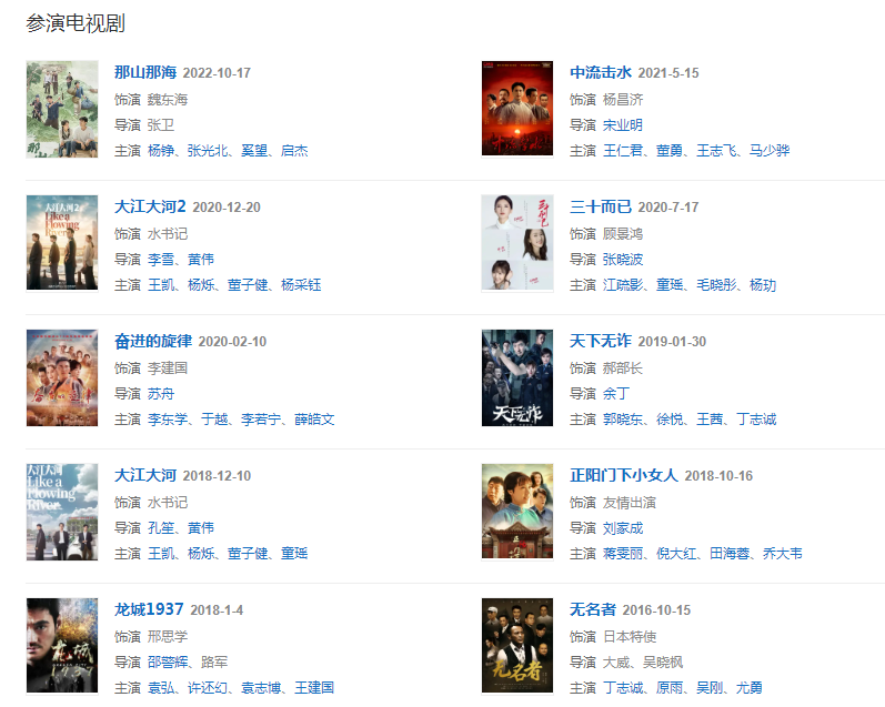 201812月出演正午陽光出品的電視劇《大江大河》,飾演水書記,12 出演電影《春天的馬拉松》,飾演護(hù)林員方向明