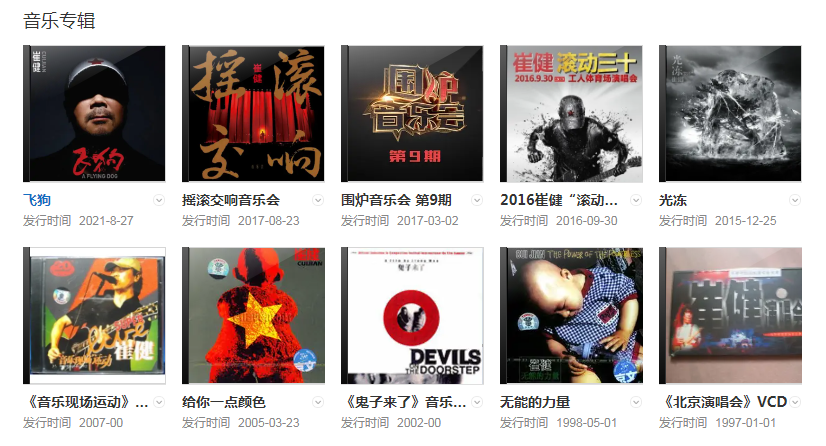 代表作品:一無所有、花房姑娘、假行僧、從頭再來、不是我不明白、新長(zhǎng)征路上的搖滾、一塊紅布、快讓我在雪地上撒點(diǎn)兒野、南泥灣、紅旗下的蛋、寬容、最后的抱怨、飛了、混子、藍(lán)色骨頭、農(nóng)村包圍城市、超越那一天、魚鳥之戀