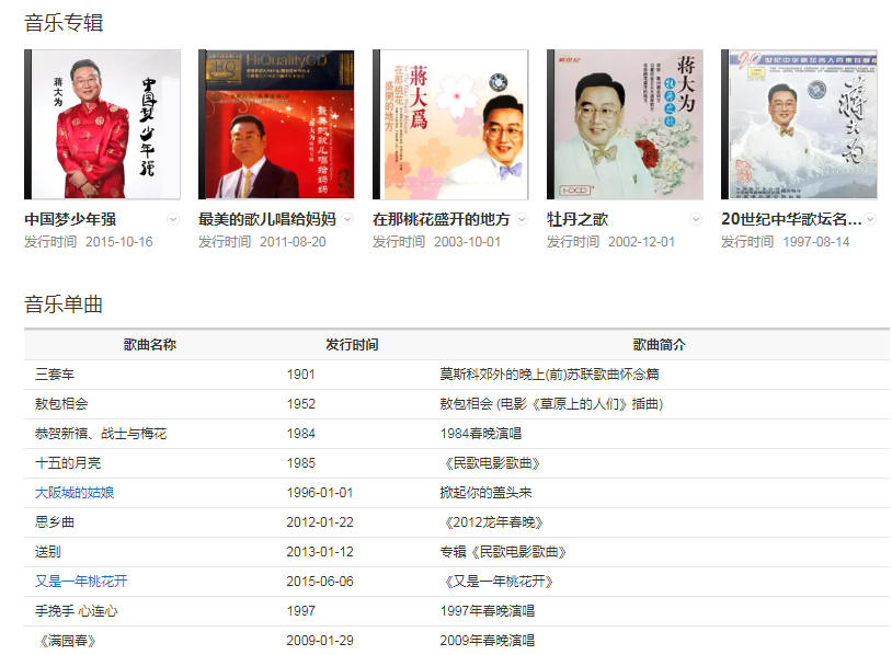蔣大為是中國男高音歌唱家,也是一位具有實(shí)力的歌唱家,八十年代他演唱電影《紅牡丹》的主題曲《牡丹之歌》一曲成名,以后一首首膾炙人口的好歌如《在那桃花盛開的地方》《敢問路在何方》等。