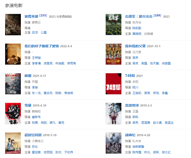代表作品:杜拉拉升職記、走向共和、和平飯店、流浪地球、林海雪原、特殊使命、山楂樹之戀、絕愛