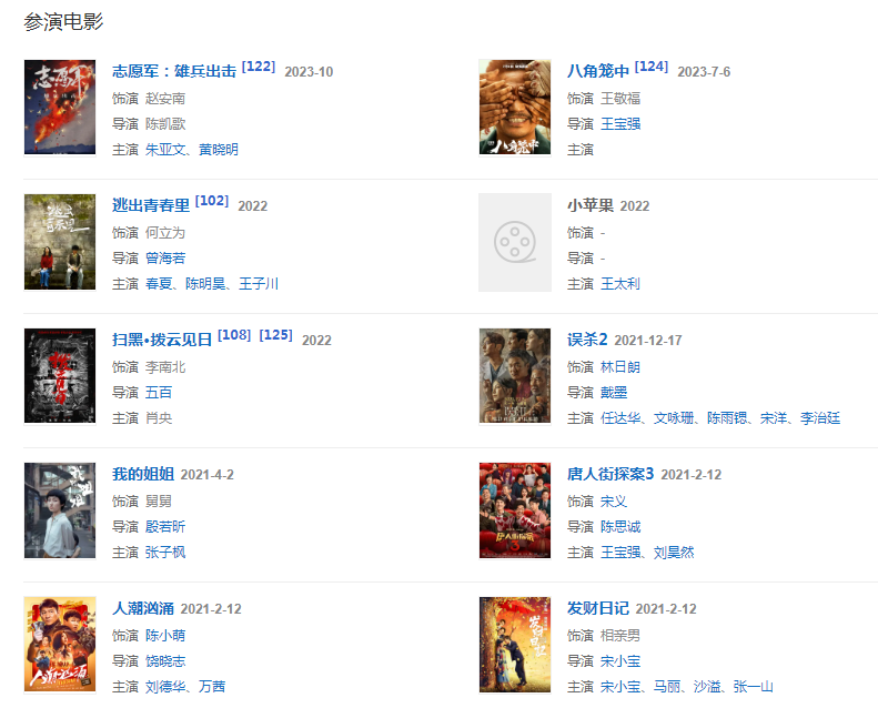 2021年,主演的喜劇犯罪電影《人潮洶涌》和電影《誤殺2》相繼上映 ;同年,主演的懸疑劇《誰是兇手》播出 。