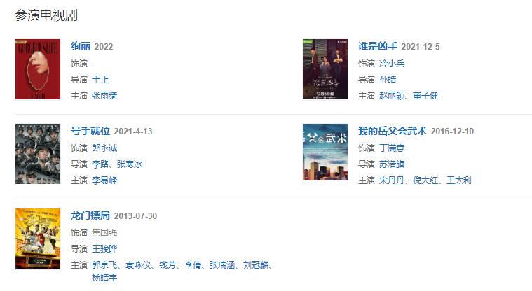 代表作品老男孩、父親、小蘋果、老男孩之猛龍過江、情圣、唐人街探案、天氣預(yù)爆、誤殺、男藝伎回憶錄