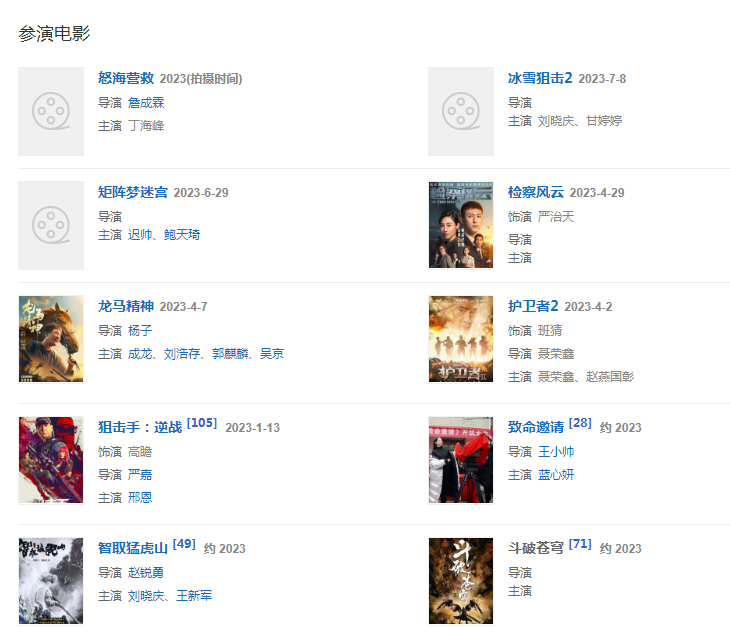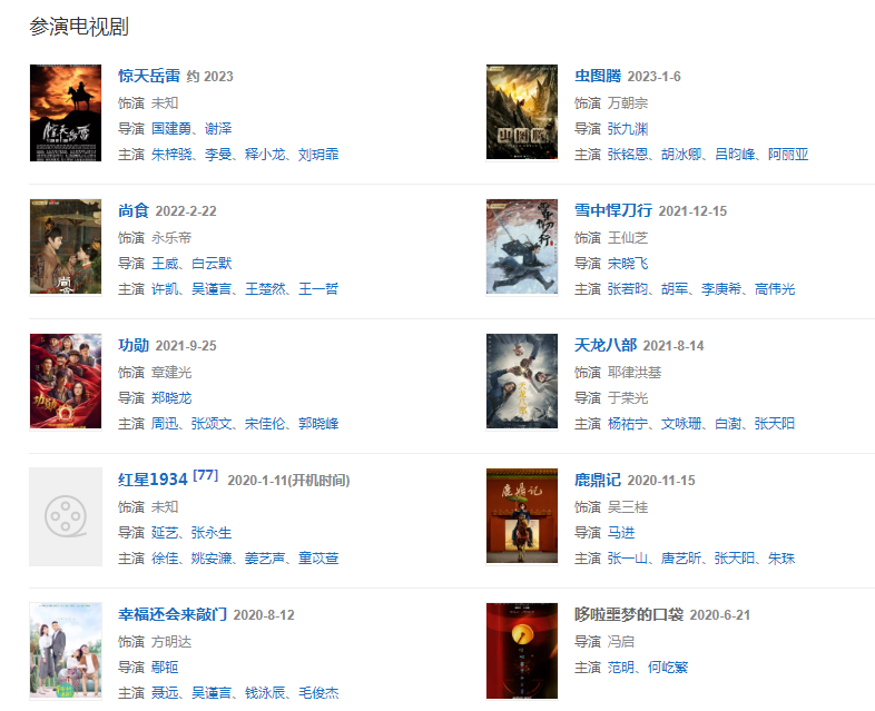 2021326日,主演的喜劇愛情電影《非正式愛情》在中國大陸上映 ;410日,執(zhí)導(dǎo)電影《農(nóng)民院士》 ;814日,執(zhí)導(dǎo)并出演的古裝武俠劇《天龍八部》播出;93日,出演的科幻災(zāi)難電影《重啟地球》上映。