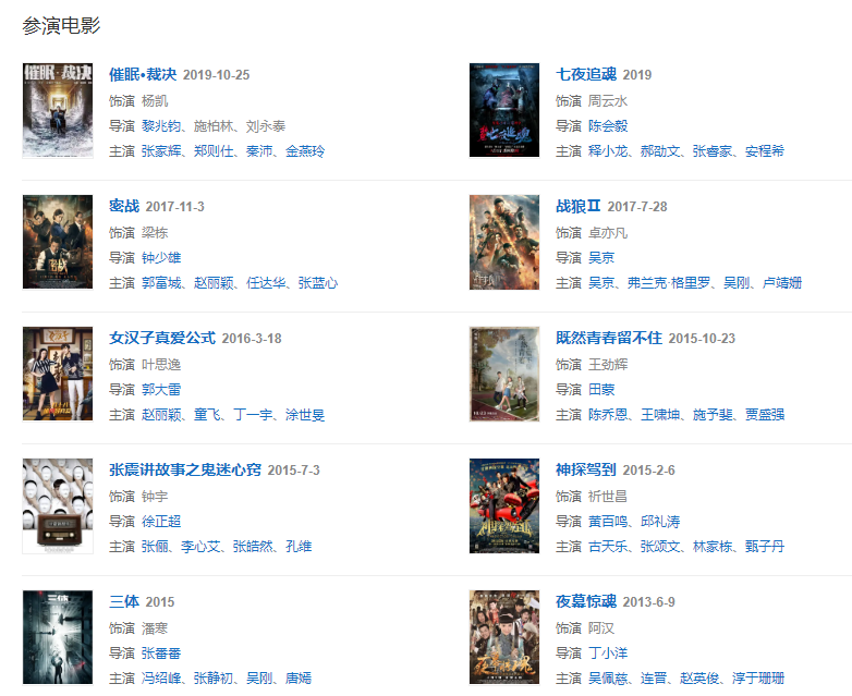 201510月,主演的青春電影《既然青春留不住》上映 ;4月,參演個人首部科幻電影《三體》 ;5月,主演古裝劇《錦衣夜行》;9月,主演年代劇《傳奇大亨》。