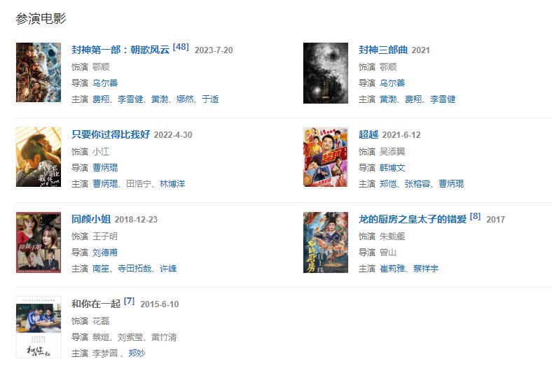 代表作品嘉南傳、戀與偶像、同顏小姐、創(chuàng)造營2019、封神三部曲、超越、星漢燦爛 、只要你過得比我好 、余生,請多指教