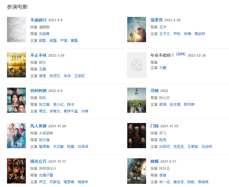 2021年,主演的愛情片《合法伴侶》和驚悚懸疑電影《門鎖》相繼上映 ;