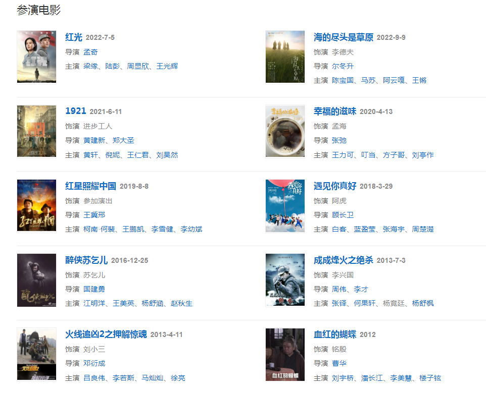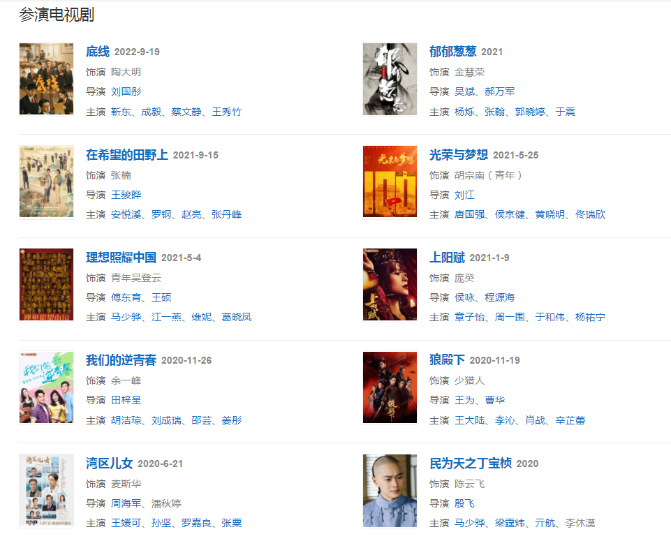 2021525日,出演的重大革命歷史題材劇《光榮與夢(mèng)想》在北京衛(wèi)視、東方衛(wèi)視及騰訊視頻、愛奇藝、優(yōu)酷同步播出  ;915日,與安悅溪主演的電視劇《在希望的田野上》在騰訊視頻播出;參演電影《1921》;  參演電視劇《理想照耀中國》。
