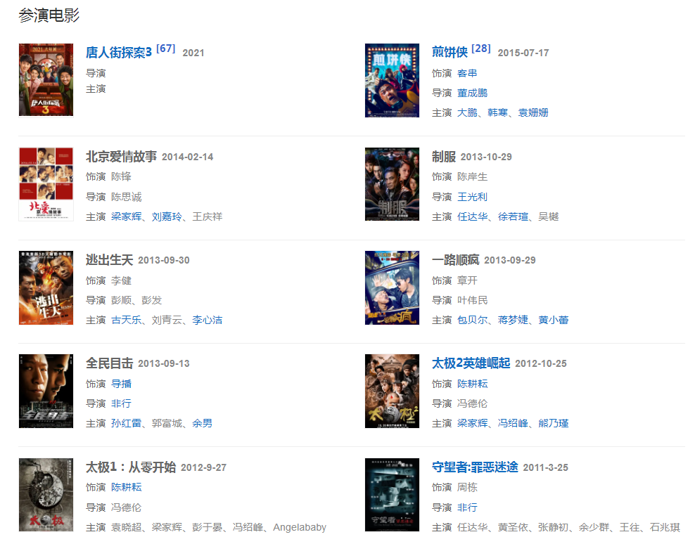 代表作品:北京愛情故事、唐人街探案系列、法官媽媽、春風沉醉的夜晚、士兵突擊、戰(zhàn)神、遠大前程