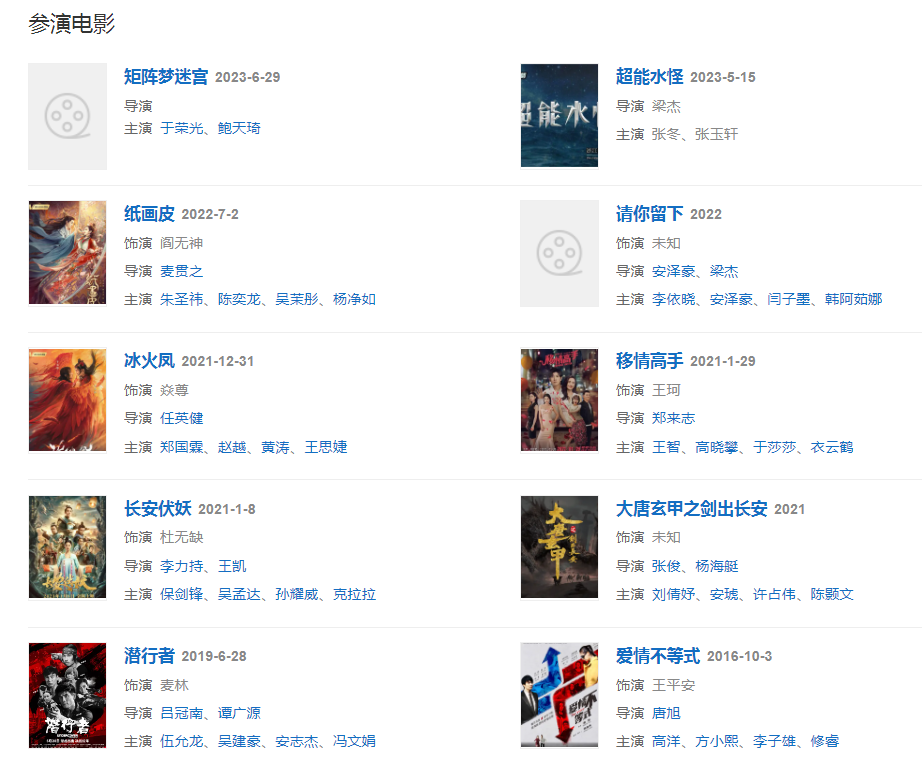 202118日,主演的動作玄幻電影《長安伏妖》上映  。410日,領(lǐng)銜主演電影《奪寶尋龍之北冥鯤宮》。1231日,遲帥主演的電影《冰火鳳》已定檔騰訊視頻獨(dú)家播出。
