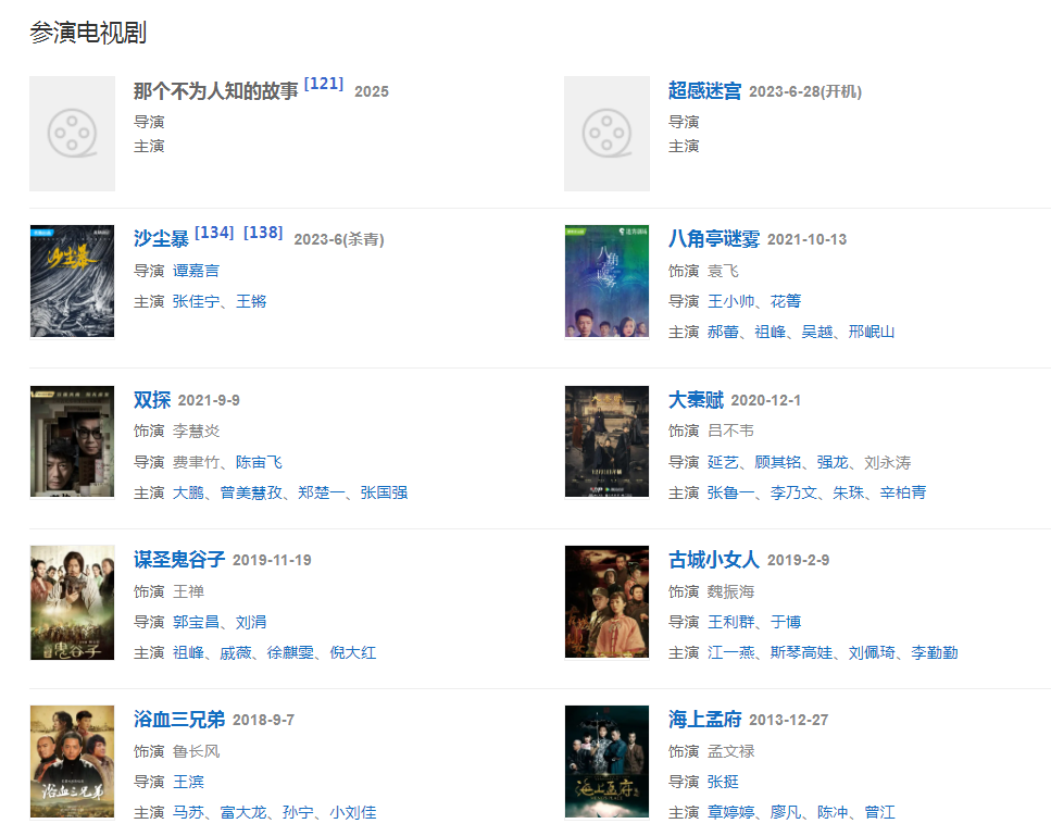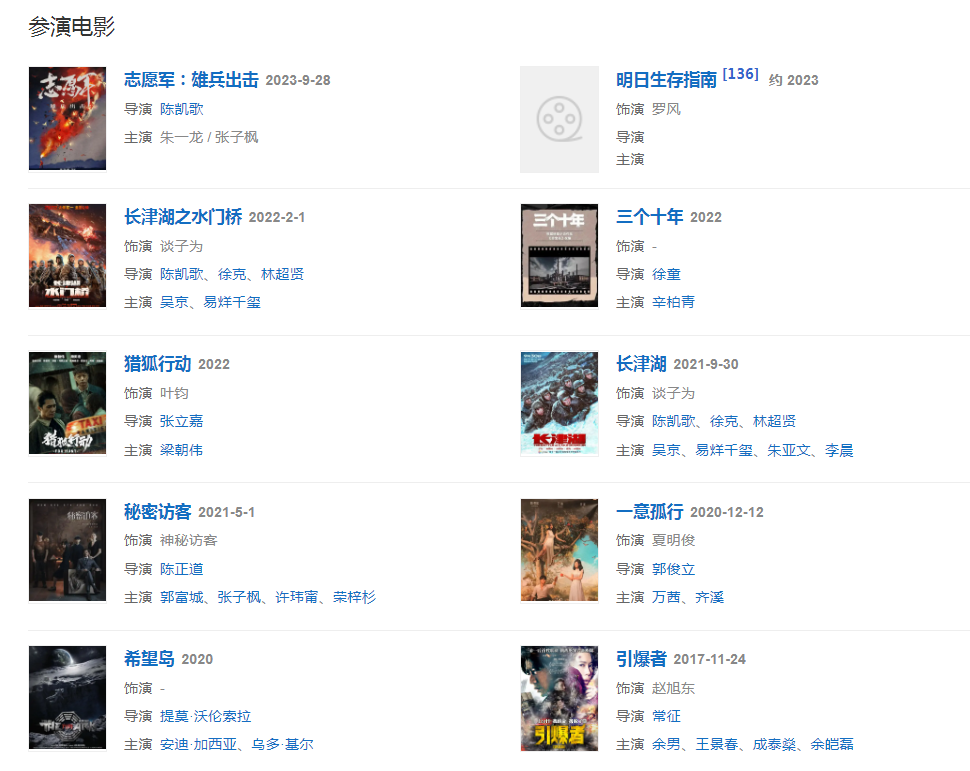 202151日,與郭富城合作主演電影《秘密訪客》上映;99日,監(jiān)制并主演的懸疑動作網(wǎng)劇《雙探》播出;930日, 特別主演的戰(zhàn)爭片《長津湖》上映;1013日,與郝蕾、祖峰、吳越、邢岷山等主演的家庭懸疑網(wǎng)劇《八角亭謎霧》在愛奇藝迷霧劇場播出。