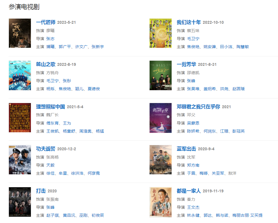 代表作品:都是一家人、巡回檢察組、人民的名義、烈火英雄、沖出亞馬遜、大染坊、大秦帝國、陳賡大將