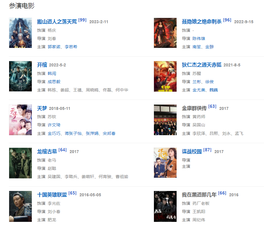代表作品:流星蝴蝶劍、三少爺?shù)膭?、少年黃飛鴻、少年包青天III之天芒傳奇