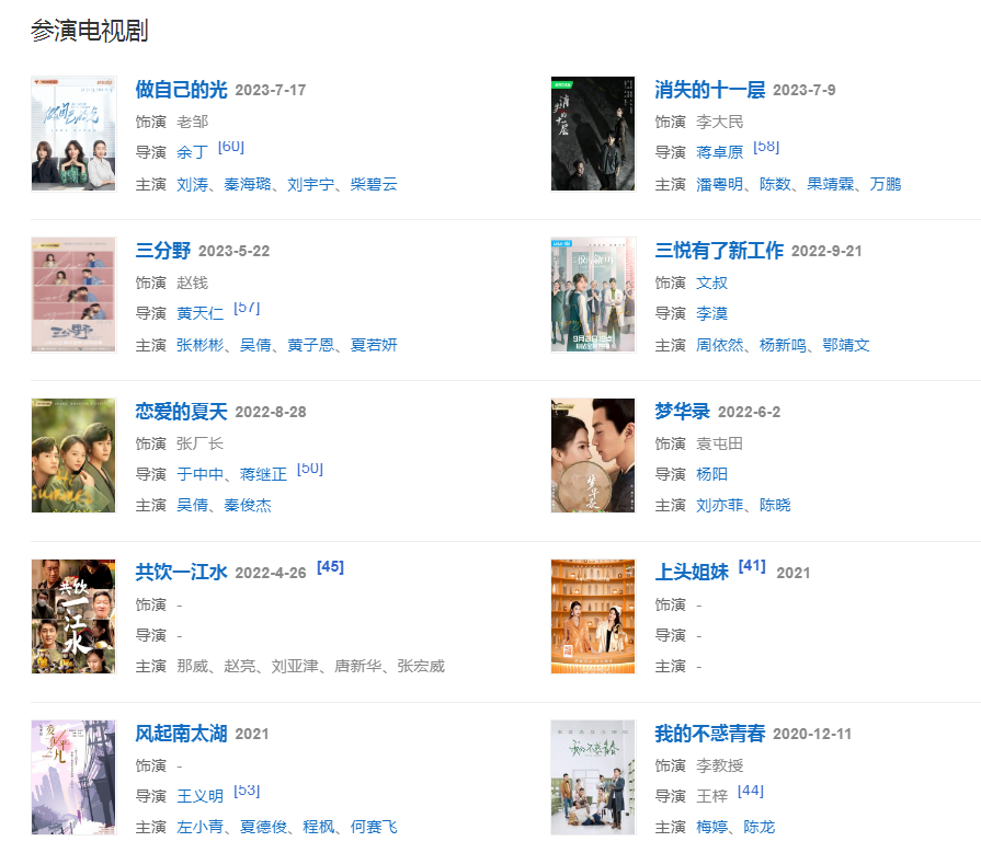 2022426日,參演的電視劇《共飲一江水》播出;62日,參演的的女性愛(ài)情勵(lì)志劇《夢(mèng)華錄》播出  。