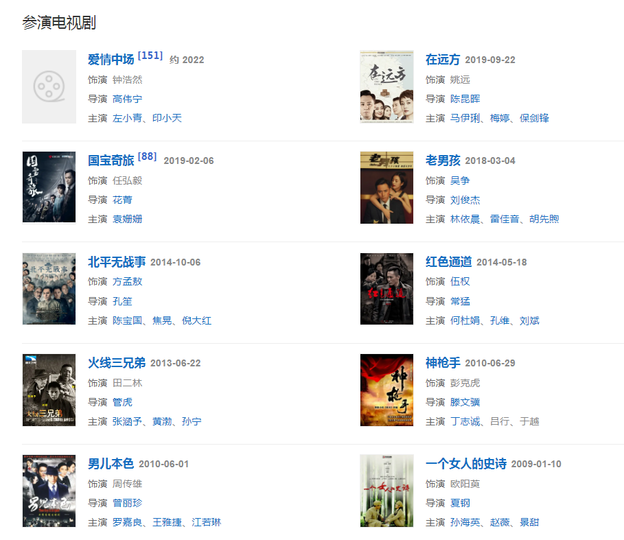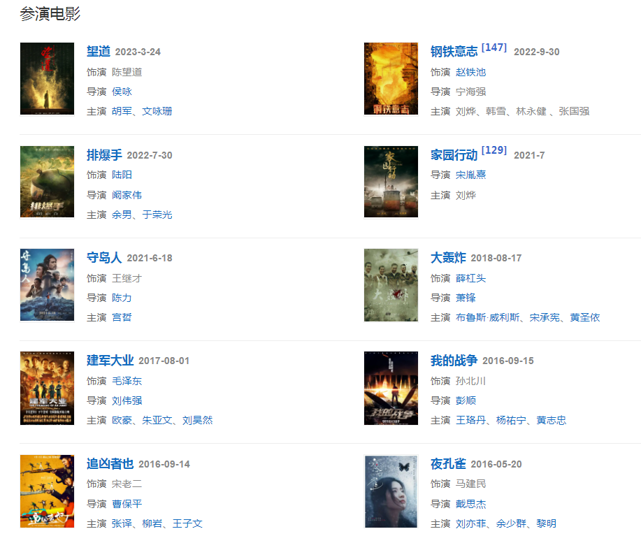 代表作品:藍宇、血色浪漫、拿什么拯救你,我的愛人、那山那人那狗、北平無戰(zhàn)事、硬漢、美人草、追兇者也、建軍大業(yè)、建黨偉業(yè)