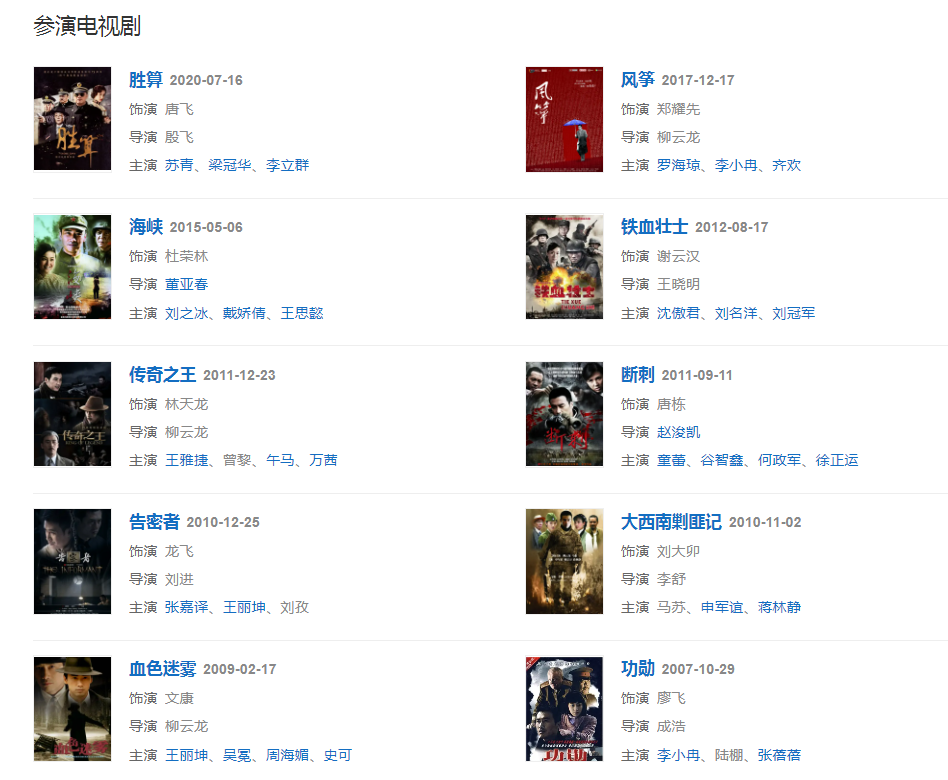 代表作品:暗算、功勛、血色迷霧、東風雨、告密者、斷刺、傳奇之王、風箏、勝算