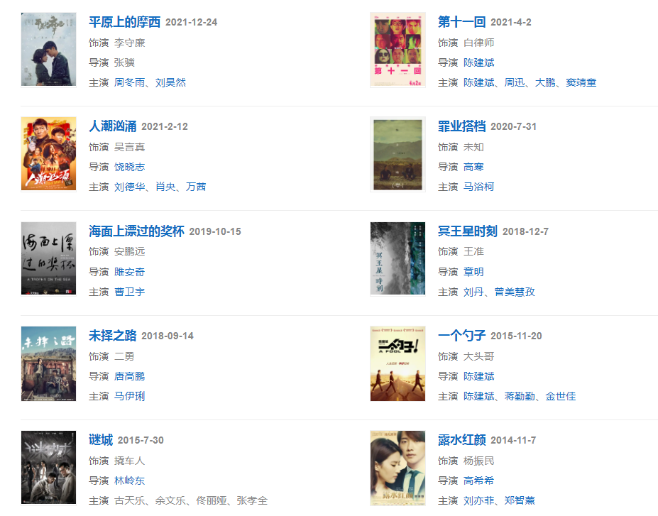 202010月,參演的電影《平原上的摩西》發(fā)布先導(dǎo)預(yù)告片  ;同年,參演的陳建斌執(zhí)導(dǎo)的電影《第十一回》上映。