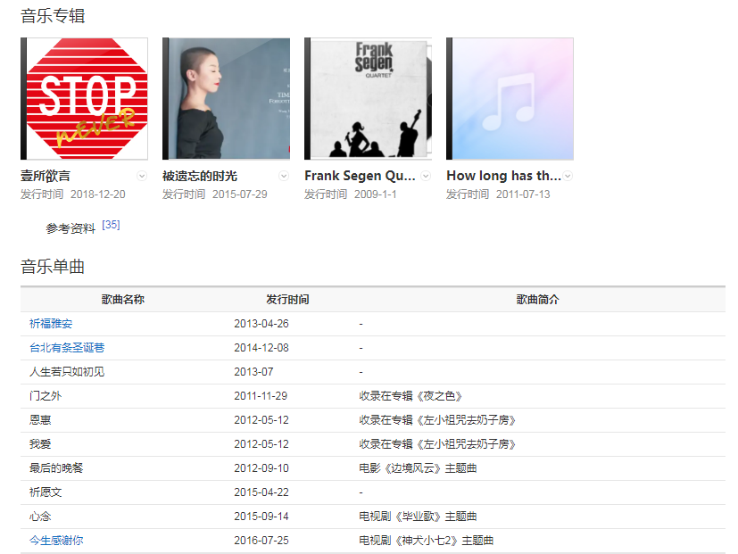 代表作品臺北有條圣誕巷、人生若只如初見、大片、中國好聲音第一季、一切無關(guān)緊要的遇見