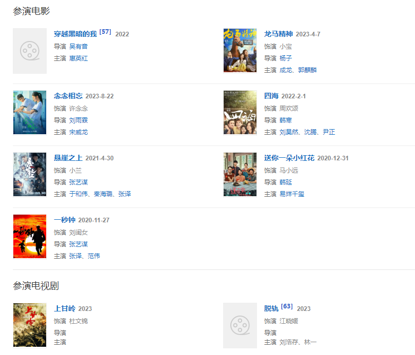 2021211日,首次登上央視春晚的舞臺;430日,主演的諜戰(zhàn)電影《懸崖之上》上映;同年,她還出演了由韓寒執(zhí)導(dǎo)的愛情動作電影《四海》。