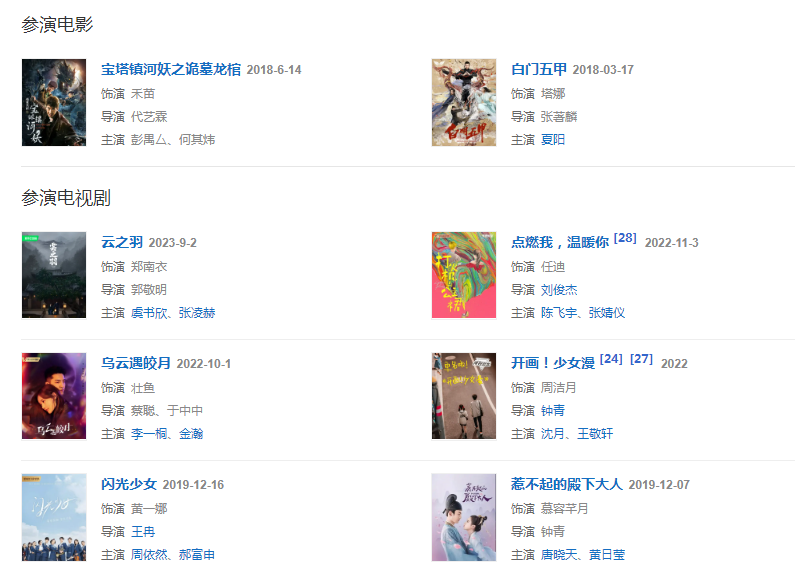 2018年1月,參演的武俠片《白門五甲》上映;隨后,她還主演了奇幻懸疑片《寶塔鎮(zhèn)河妖之詭墓龍棺》。2019年12月,主演的古裝愛情劇《惹不起的殿下大人》在雙平臺播出。