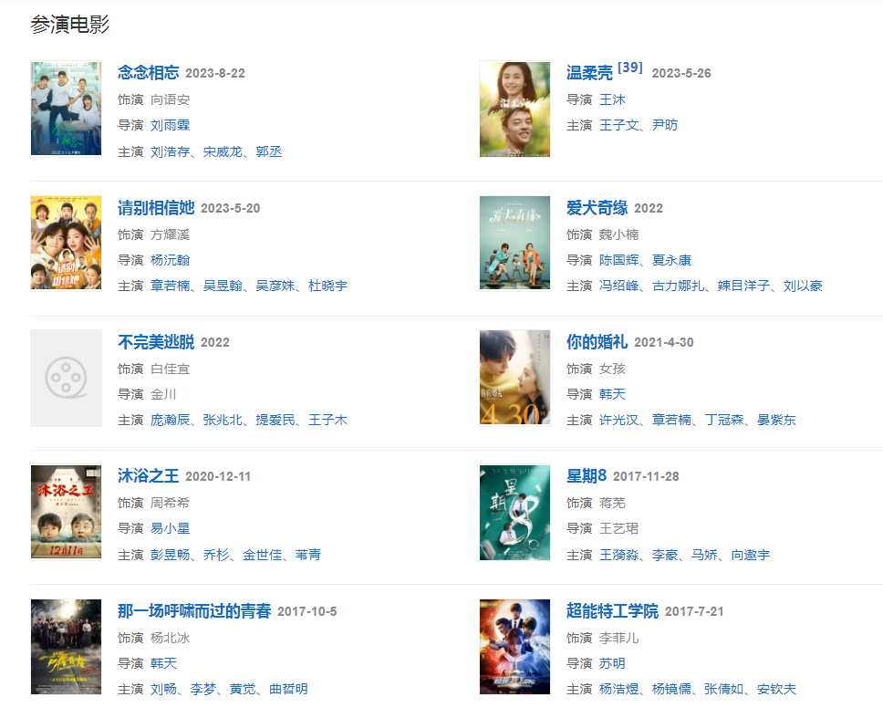 代表作品:忽而今夏、驢得水、那一場呼嘯而過的青春、二十不惑、沐浴之王 、公子傾城
